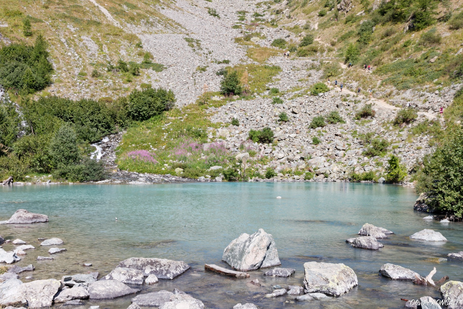 Le lac de la Douche, en raison de son altitude, marque également la limite de la forêt. Au-dessus du lac, en effet, plus d’arbres : le torrent serpente dans un vallon herbeux et des pierriers. Le contraste avec la partie basse de la randonnée et saisissant.