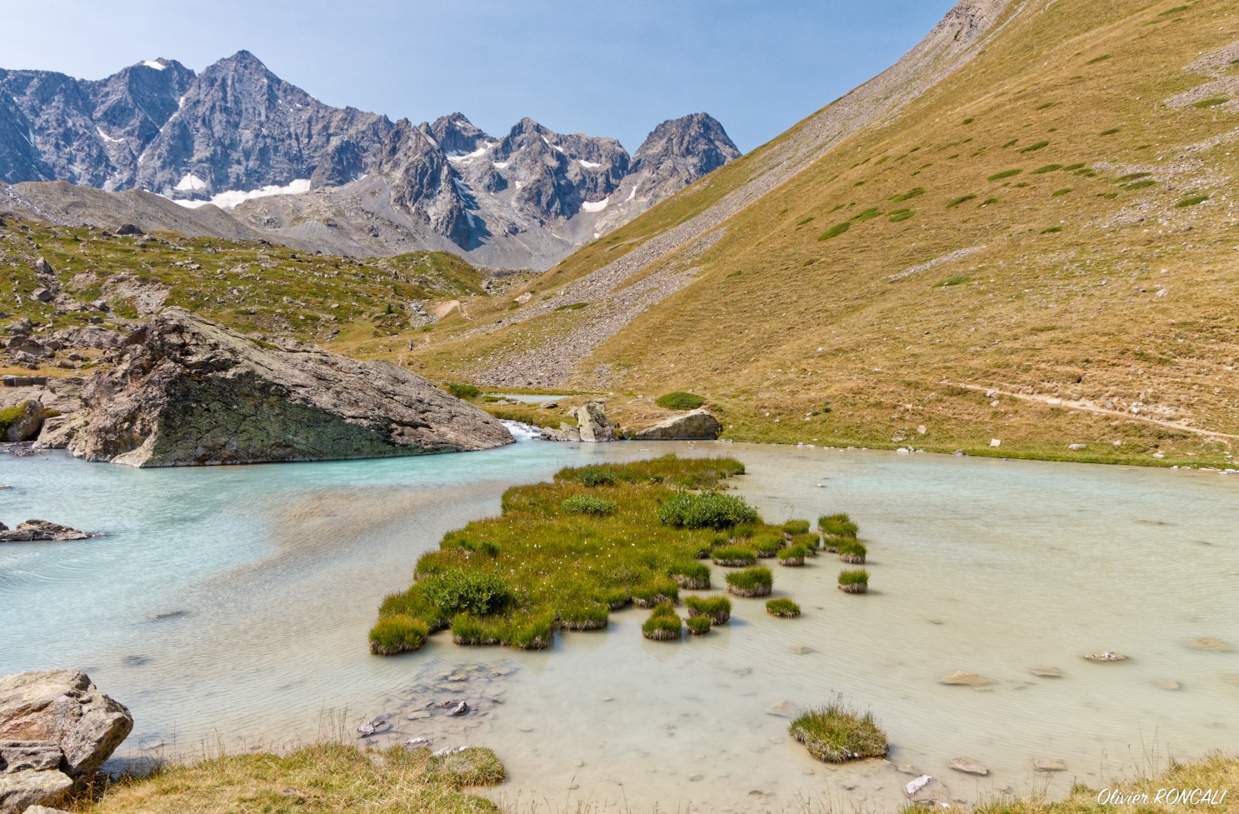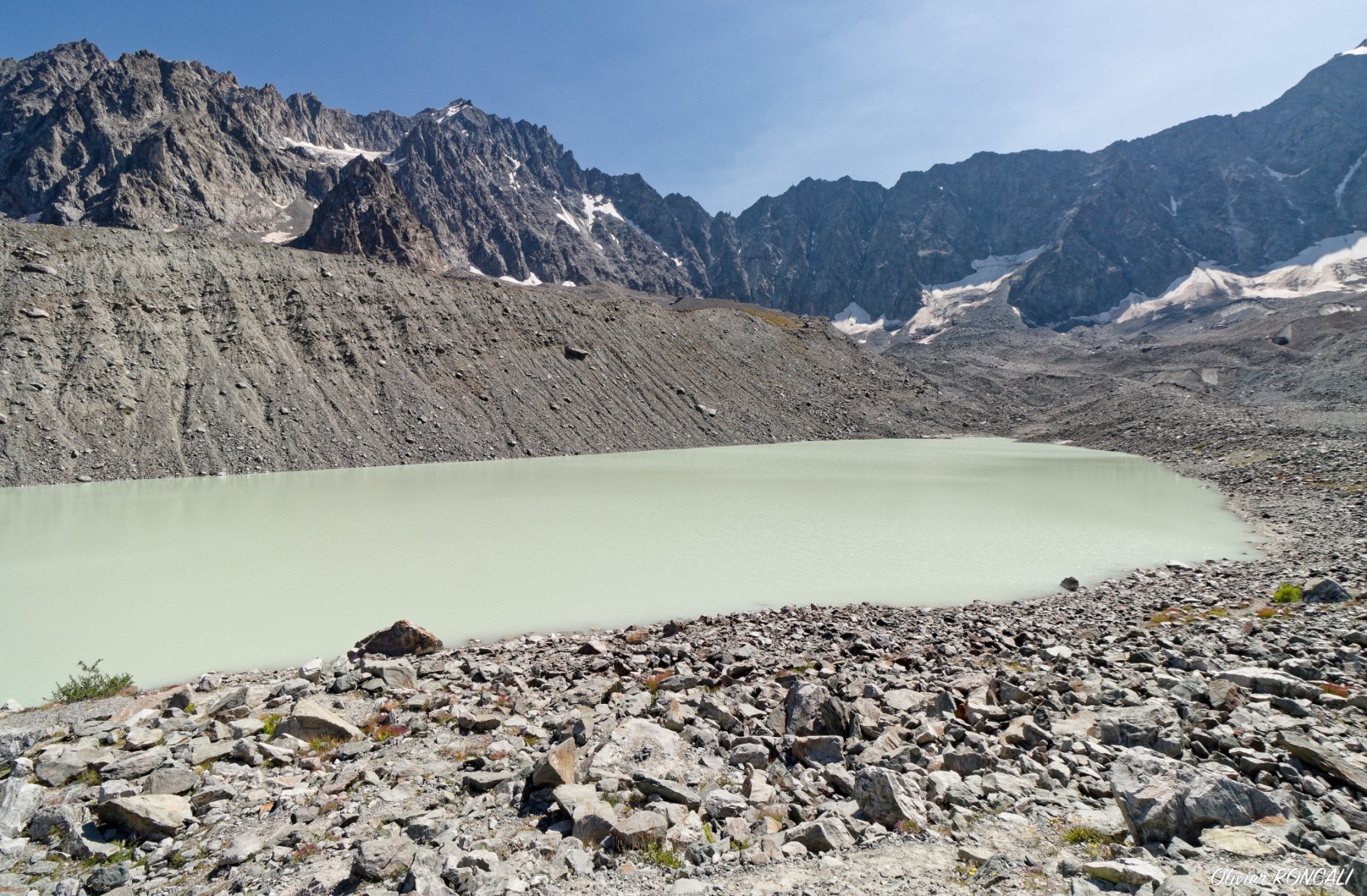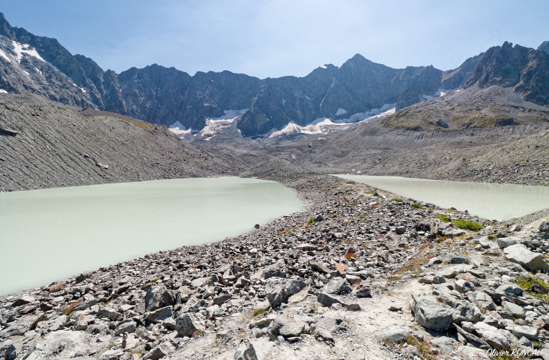 L’arrivée au cirque du glacier d’Arsine offre un spectacle grandiose avec les deux grands lacs en premier plan et le glacier ai fond.