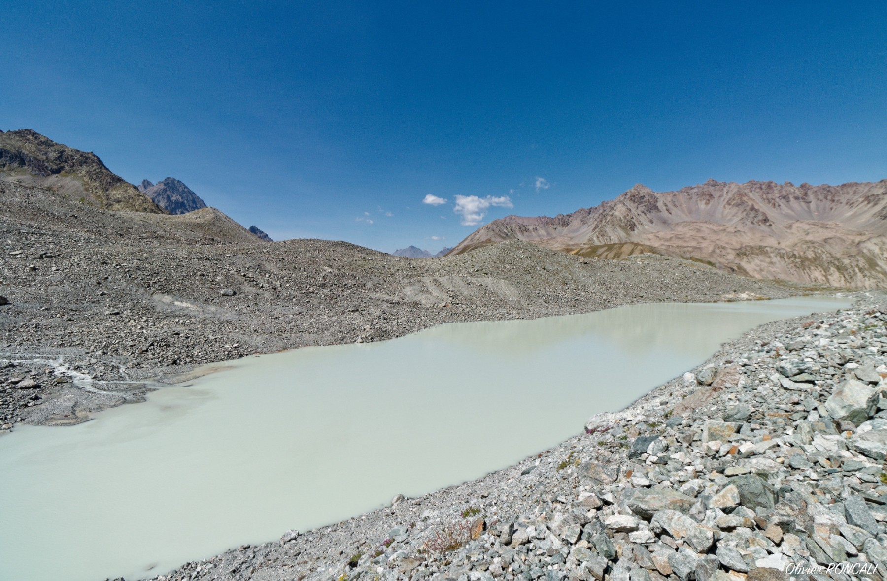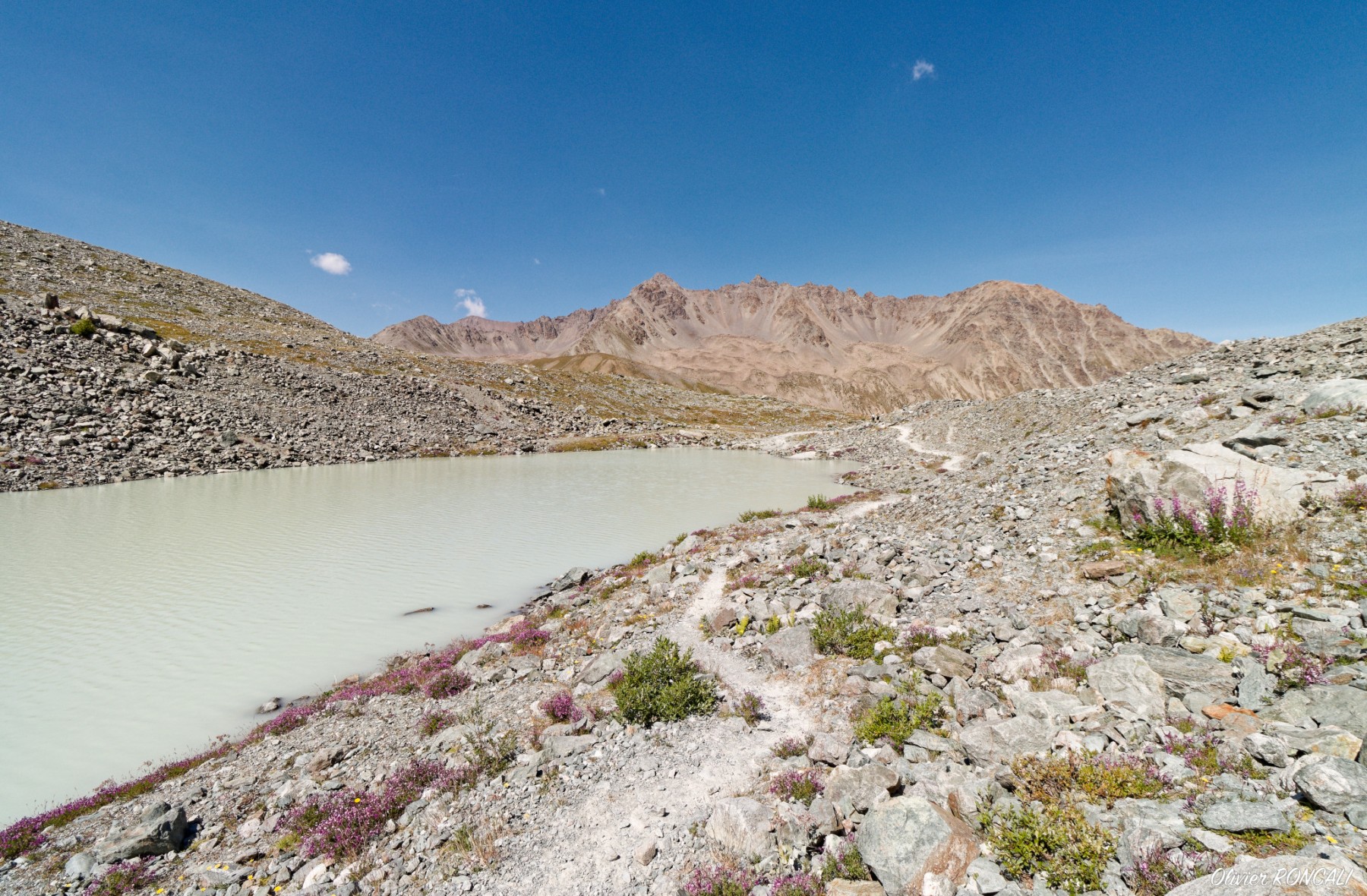 A l’issue de cette lente montée, on arrive enfin au col d’Arsine, à 2 348 m. Nous sommes alors à la jonction des deux randonnées donnant accès aux lacs d’Arsine. Il reste encore la dernière « ligne droite » : la montée jusqu’aux lacs par la moraine du glacier d’Arsine.